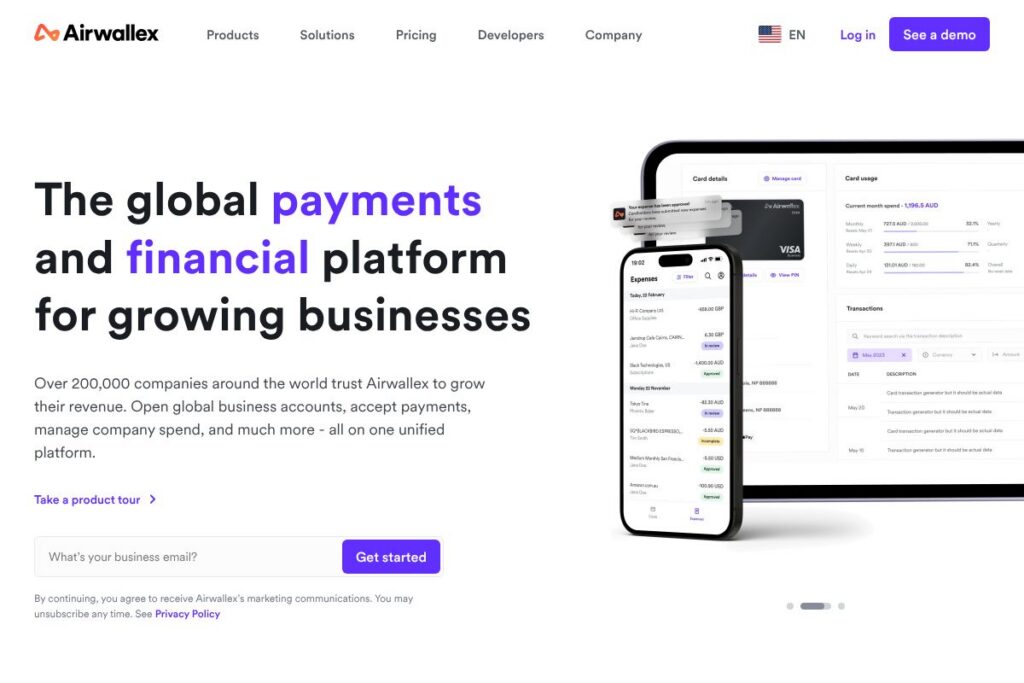 Businesses can accept card payments, local payment methods, and wallet payments through integrated payment rails and hosted checkout options. Settlement flows into Airwallex accounts to simplify funds management across markets.