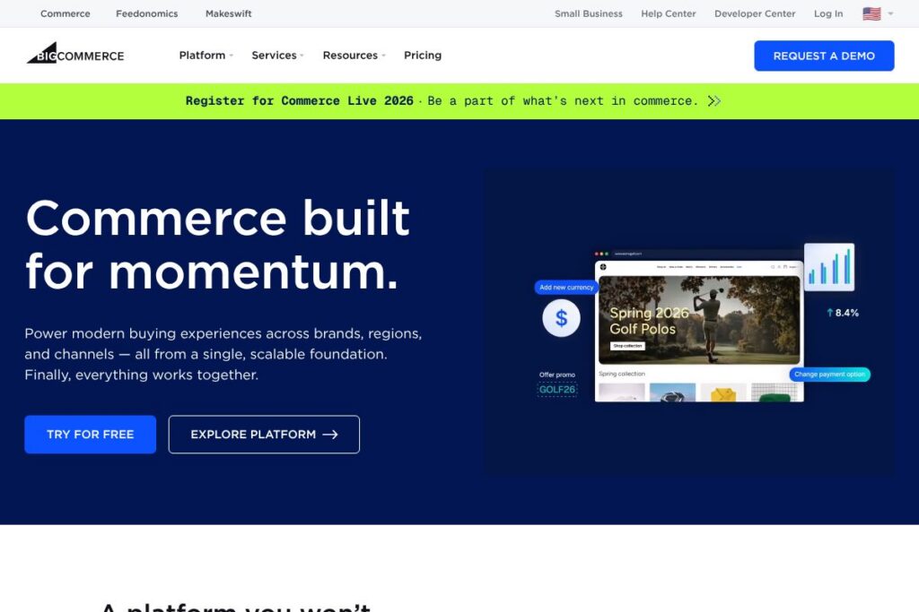BigCommerce bundles storefront management, flexible checkout, B2B capabilities, and a robust API layer. Recent emphasis has been on Custom Checkout, the B2B Edition, and deeper channel feed support through partners like Feedonomics, all designed to reduce friction when selling across many surfaces.