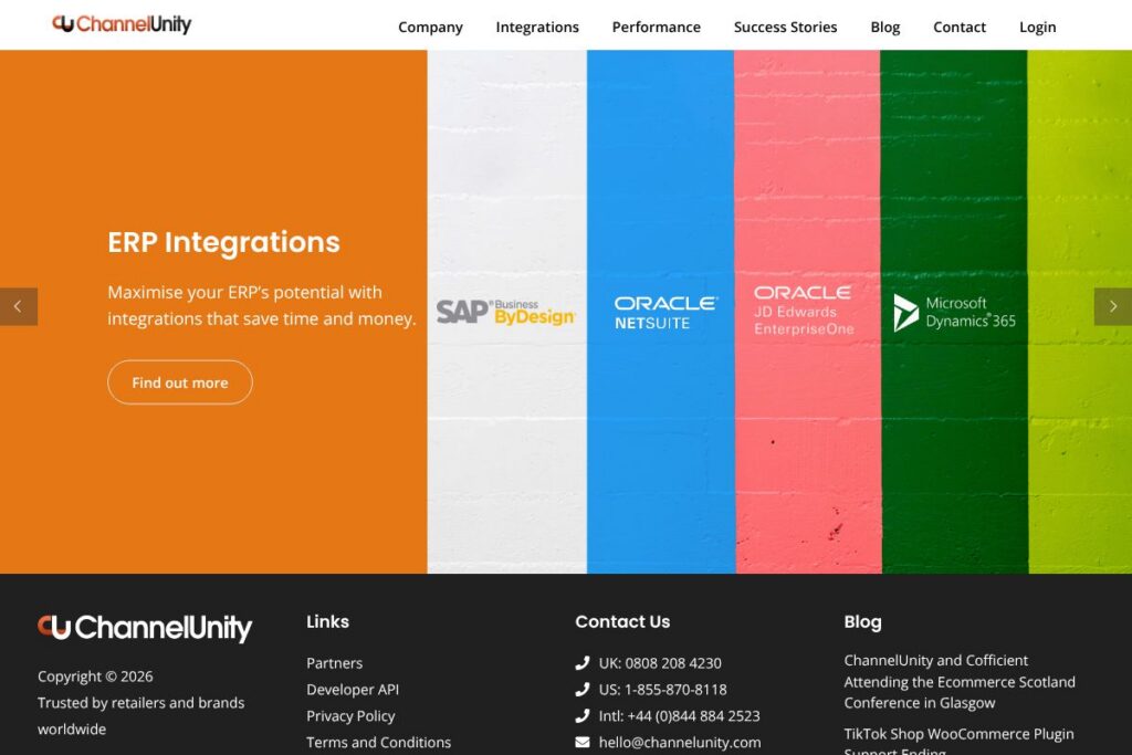 ChannelUnity provides implementation support and post-launch customer success to help adapt connectors for complex product catalogs and ERP logic. The provider showcases customer outcomes and case studies that explain integration approaches and measurable results.