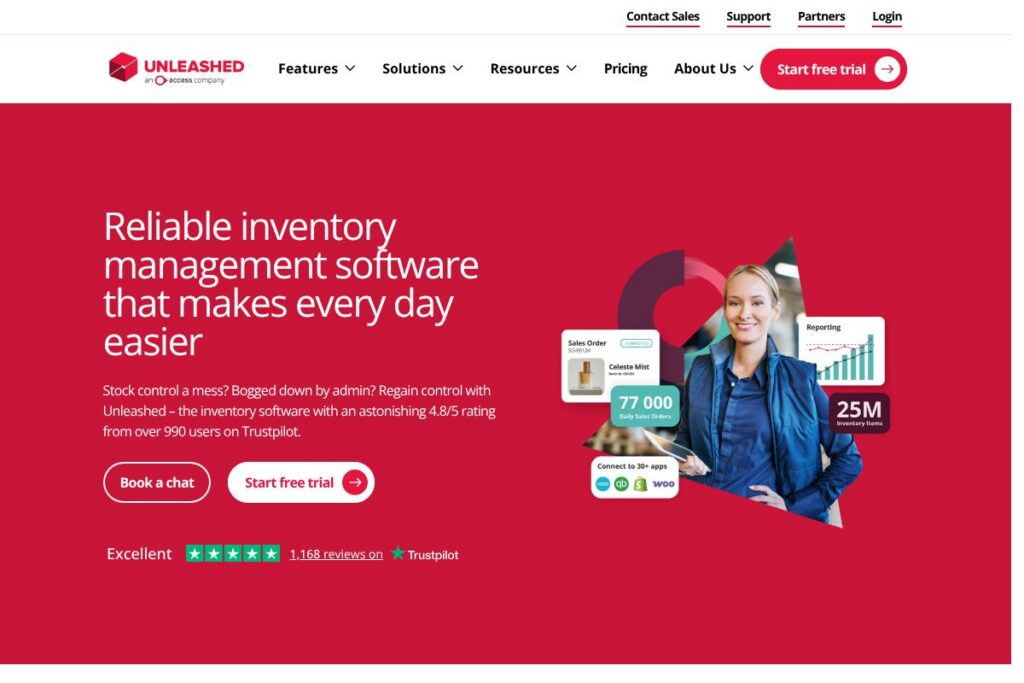 Unleashed organises inventory, purchasing, production, and sales data around accurate stock valuation and traceability. Core capabilities include multi-warehouse stock control, purchase order automation, bills of materials, batch and serial tracking, inventory forecasting, and business intelligence reporting. The platform has expanded its interface with a natural language assistant called Access Evo for faster data queries and task shortcuts.
