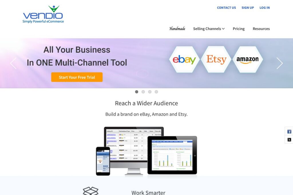 Vendio is a multi-channel ecommerce platform designed to help online sellers manage listings, inventory, orders, and shipping from a single dashboard. It focuses on connecting storefronts and marketplace channels so sellers can create listings once and publish them across eBay, Amazon, Etsy, and other marketplaces while keeping inventory synchronized.