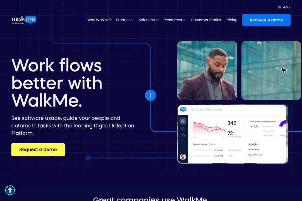 WalkMe excels at delivering enterprise-scale digital adoption capabilities that combine in-app guidance, behavioral analytics, and selective automation to reduce friction in critical workflows. Its strengths are most visible in complex environments where multiple applications, large user populations, and regulatory or process compliance requirements demand centralized guidance and governance.